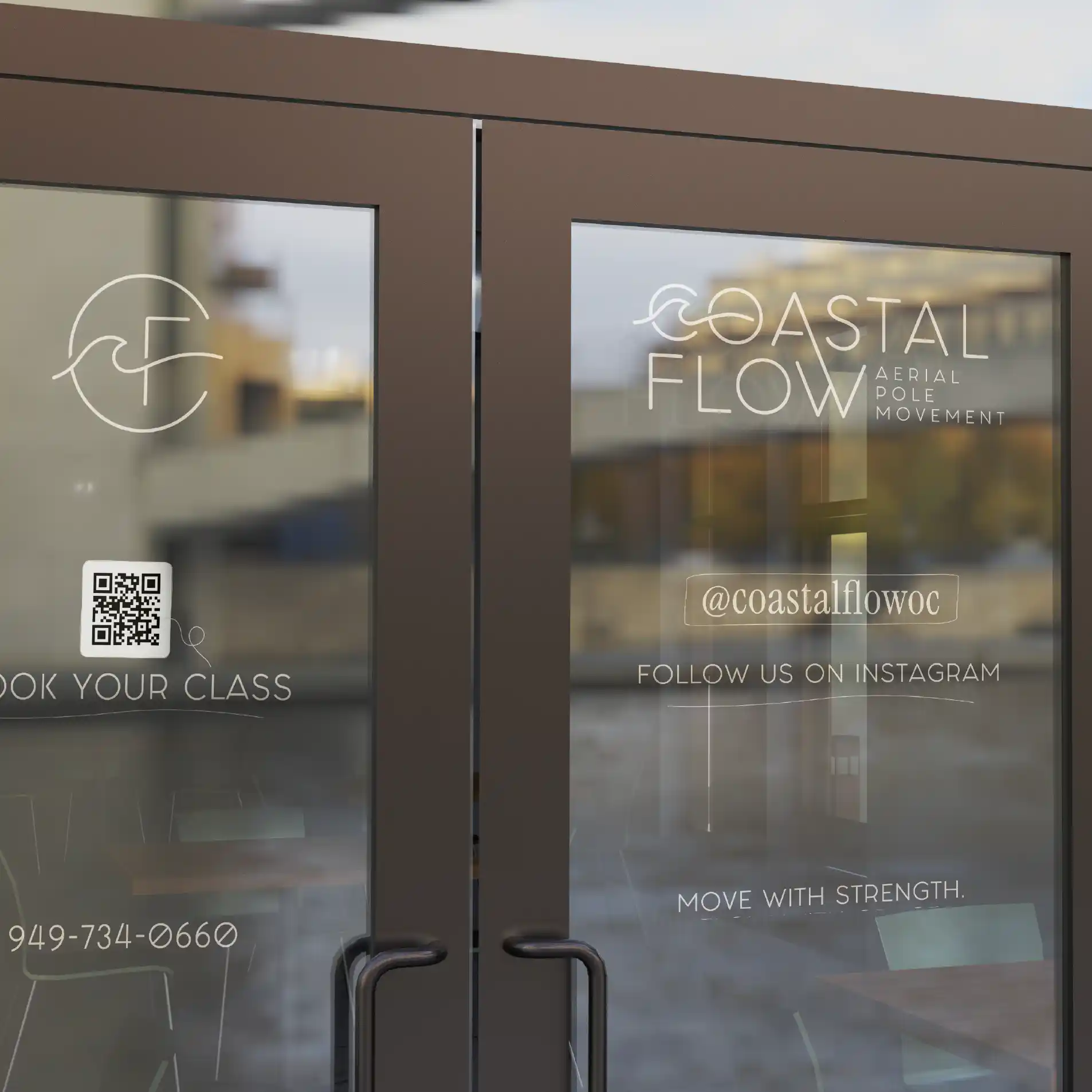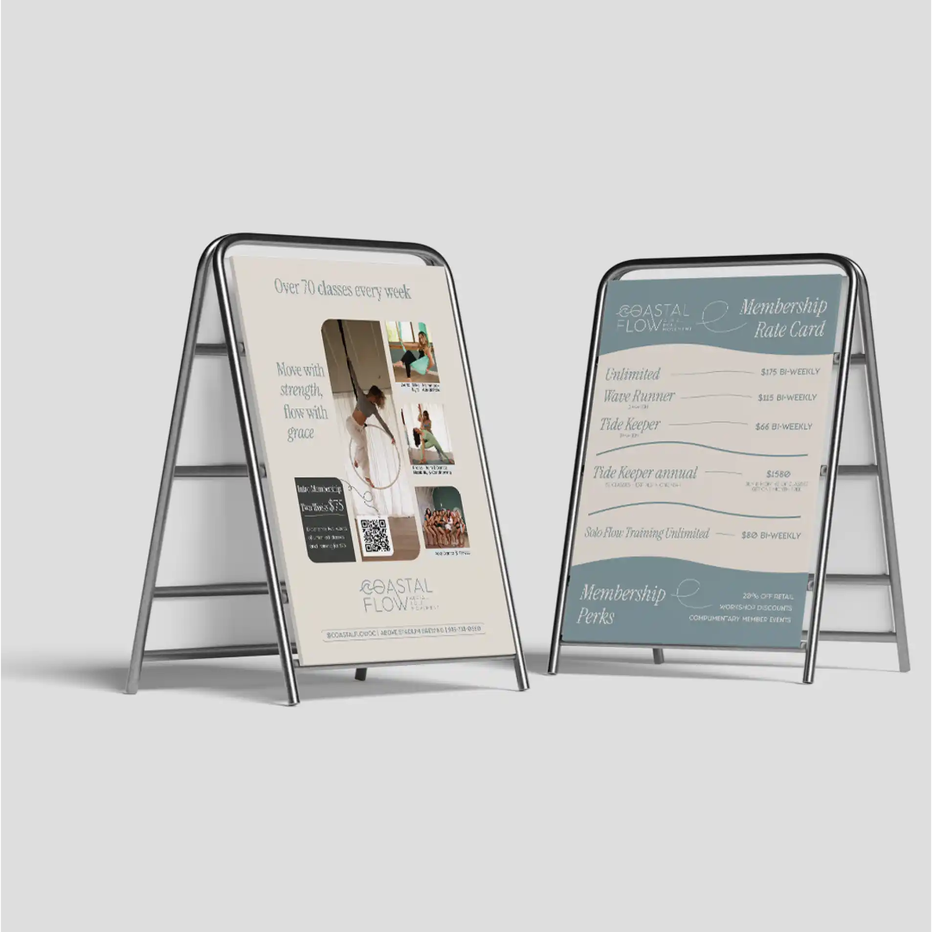 El trabajo incluyó el desarrollo y aplicación del sistema visual en múltiples puntos de contacto: redes sociales, piezas promocionales, señalética del estudio, vidriera, papelería y contenido para pantallas internas. Cada pieza fue diseñada para mantener coherencia visual y reforzar la identidad de Coastal Flow tanto en el espacio físico como en el entorno digital.